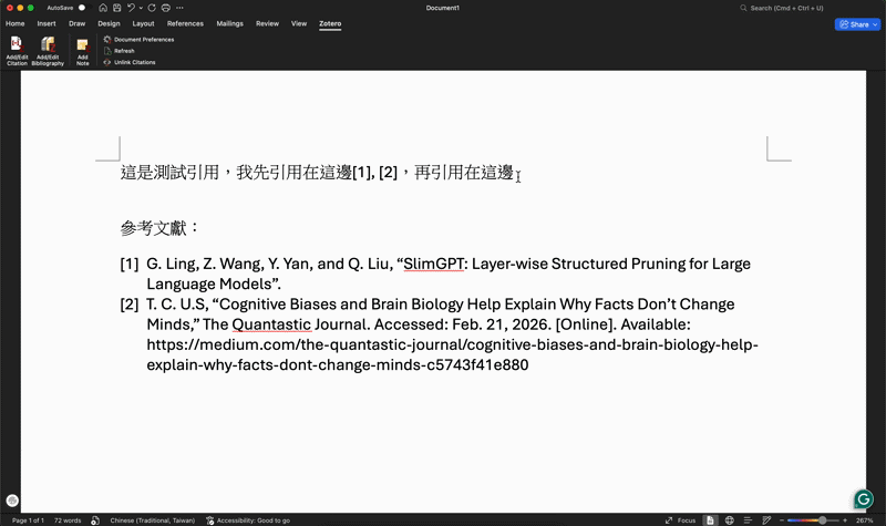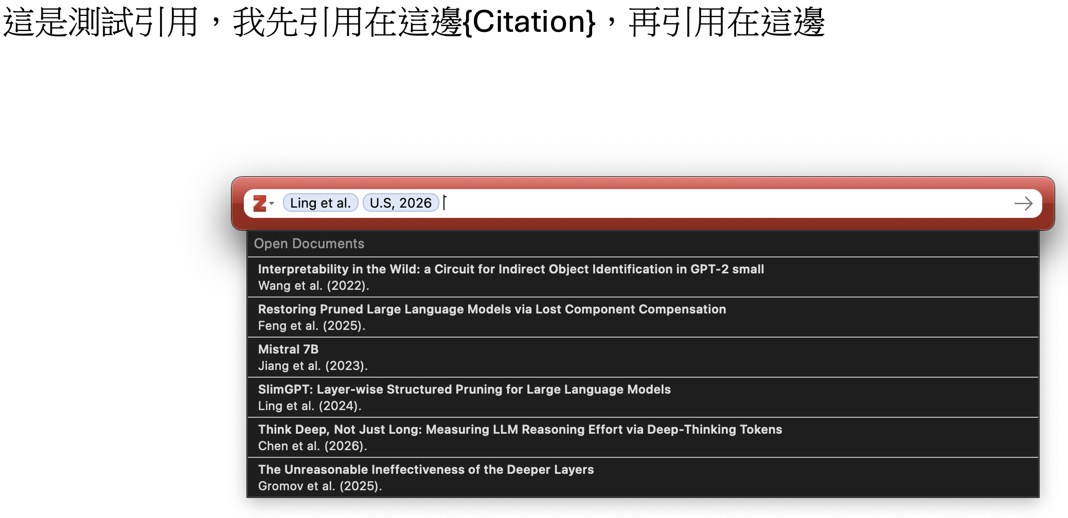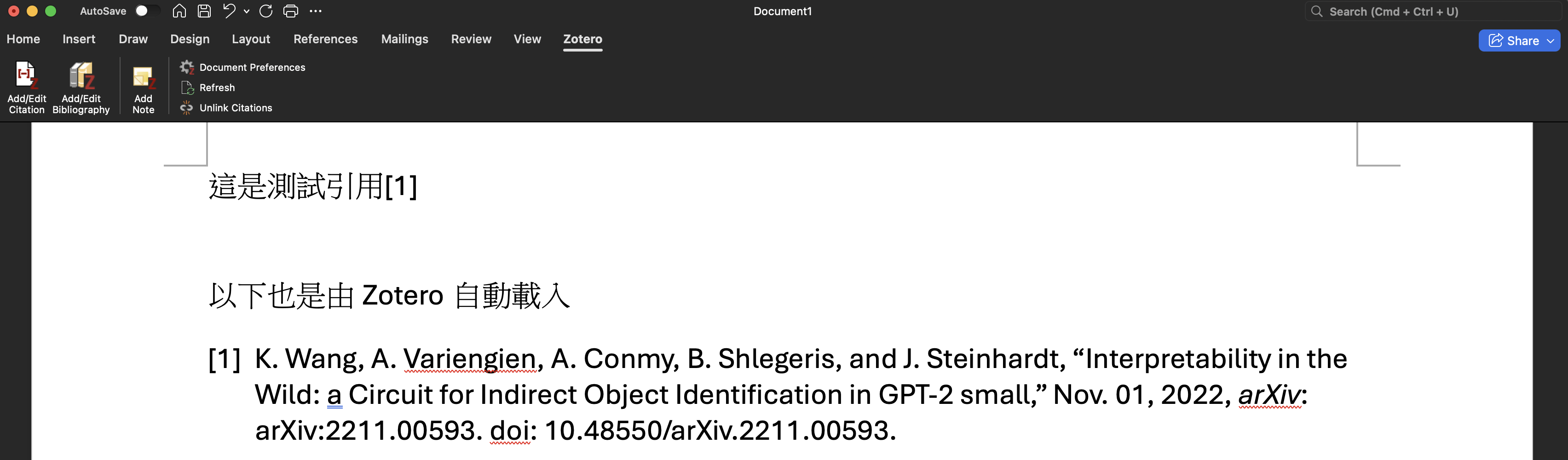 選擇選單中的 Zotero 後,即可插入引用和新增參考文獻。
