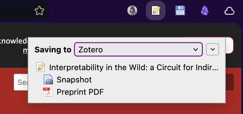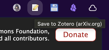 一旦進入想下載的 paper 的頁面,Zotero 瀏覽器插件會自動識別出這是 arxiv 上的文獻。 點擊後 PDF 和該頁面的 html 快照會自動下載至 Zotero 當前的資料夾中。