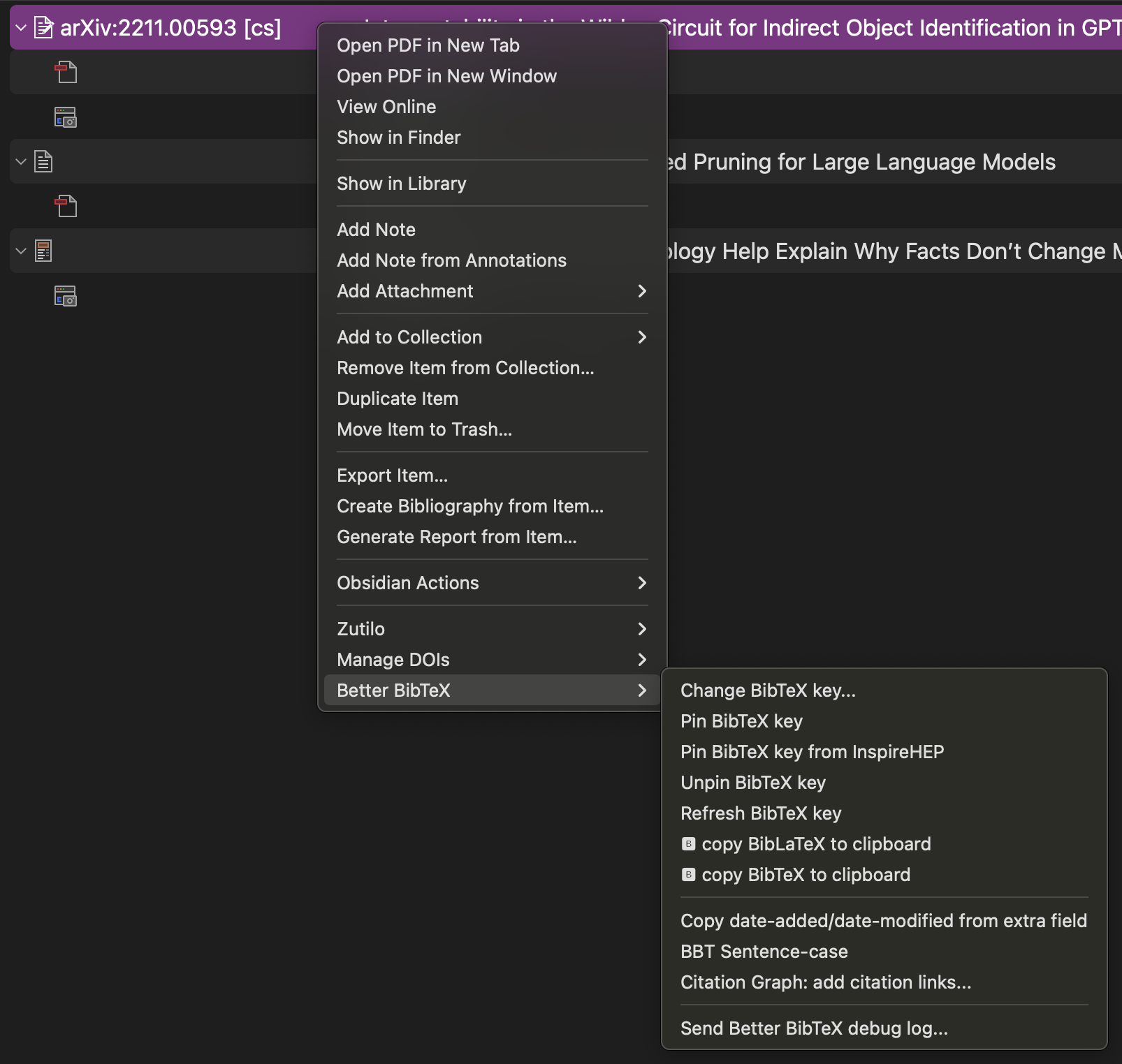 接著,對想引用的文獻 右鍵 -> Better BibTeX -> copy BibTeX to clipboard