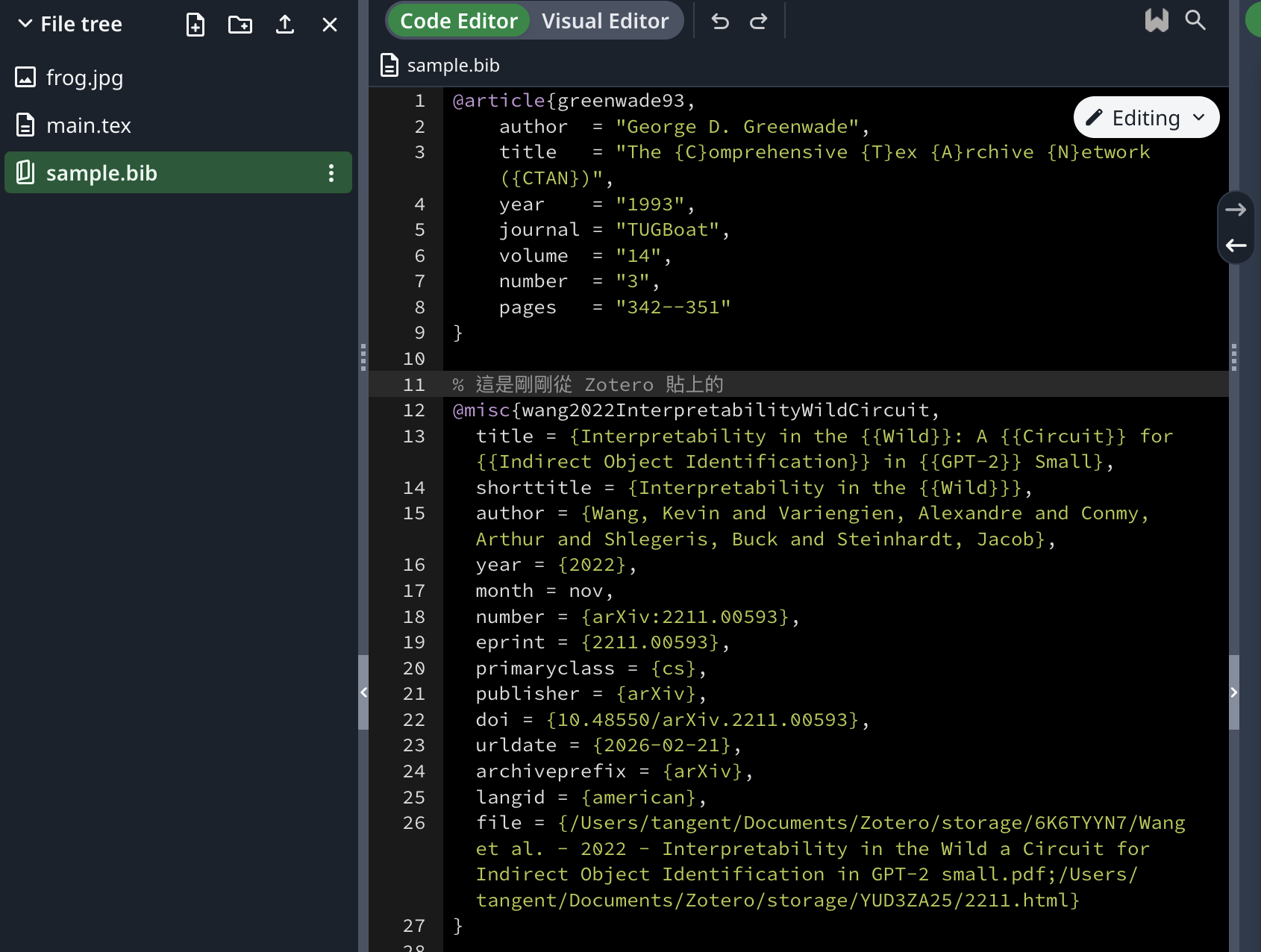 在安裝 Better BibTeX 插件後,可以快速取得下方的引用資料,直接貼進 LaTeX/Overleaf 中