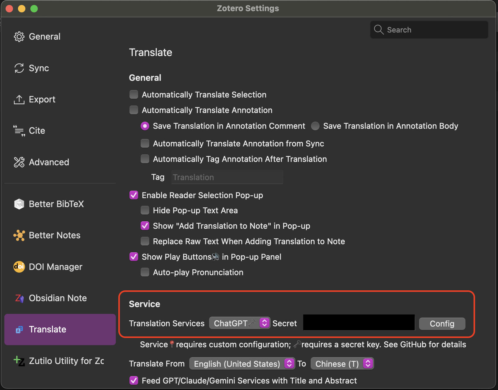 若想使用自己的API key用ChatGPT來翻譯,請去Zotero 的設定 (MacOS 快捷鍵