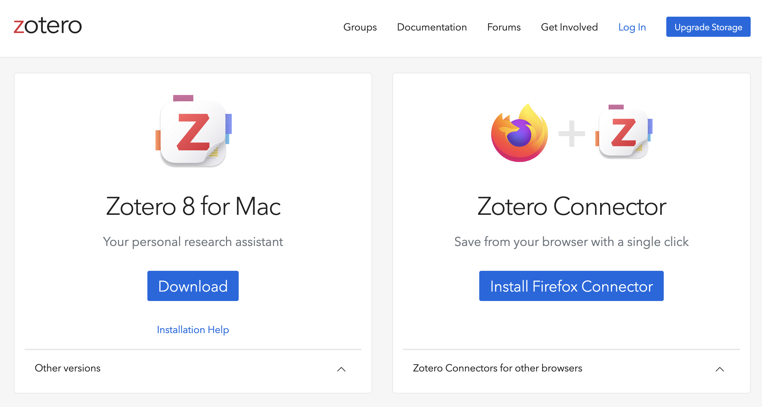 左邊是下載對應作業系統的版本,右邊是瀏覽器插件。兩個都裝可以讓 Zotero 發揮最強大的能力!
