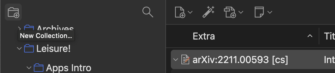 在左上角有一個像資料夾的圖示,相當於幫 project 或是正在撰寫的論文開一個資料夾,來存放和它相關的文獻。 點進去這個 collection 後,任何從 Zotero Connector(瀏覽器插件) 下載的文件會自動收納在這個 collection 底下。