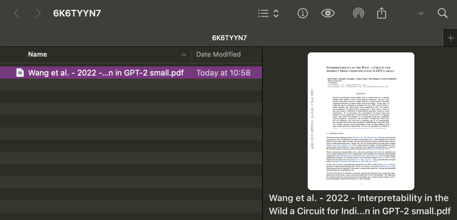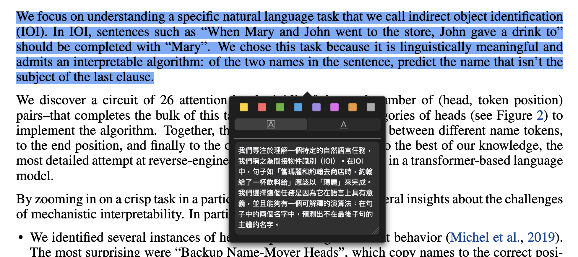 K. Wang, A. Variengien, A. Conmy, B. Shlegeris, and J. Steinhardt, “Interpretability in the Wild: a Circuit for Indirect Object Identification in GPT-2 small,” Nov. 01, 2022, _arXiv_: arXiv:2211.00593. doi: [10.48550/arXiv.2211.00593](https://doi.org/10.48550/arXiv.2211.00593).