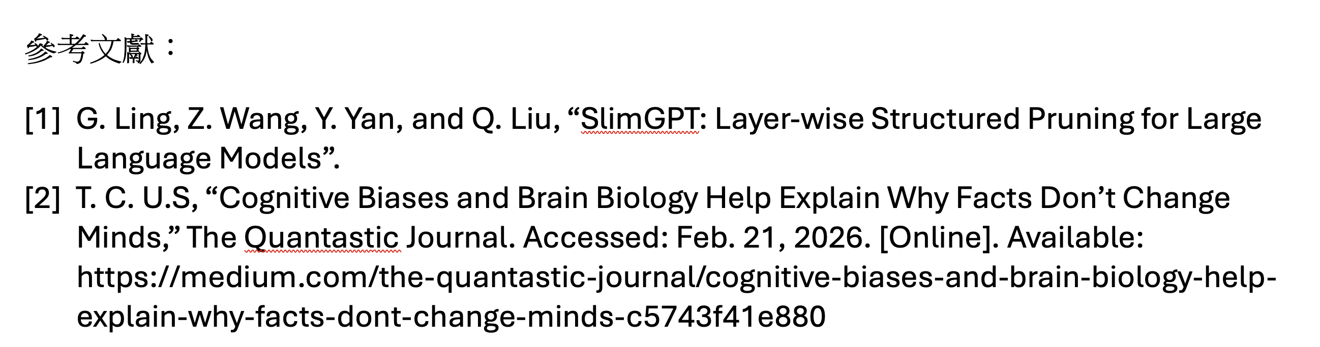 Zotero 內建了很多不同的引用標準。 這邊以IEEE標準為例,結果如下: